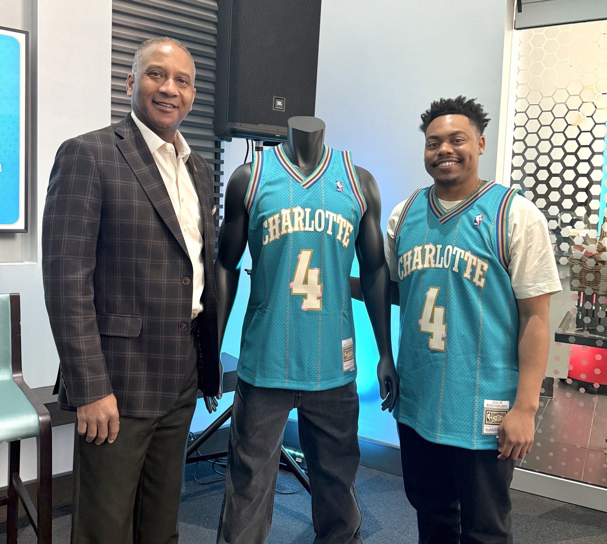 Hornets Chief Marketing Officer Seth Bennett and Mike Jones in front of the newly unveiled Charlotte Hornets Black Excellence Jersey.