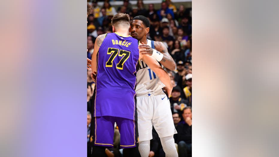 LOS ANGELES, CA – FEBRUARY 25: Kyrie Irving #11 of the Dallas Mavericks and Luka Doncic #77 of the Los Angeles Lakers hug before the game on February 25, 2025 at Crypto.Com Arena in Los Angeles, California. NOTE TO USER: User expressly acknowledges a