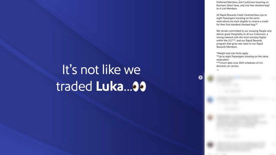 Southwest posted on Instagram with text that read, “It’s not like we traded Luka… 👀”—a reference to two controversial decisions affecting Dallas fans: the airline’s policy change and the Mavericks’ recent blockbuster trade.