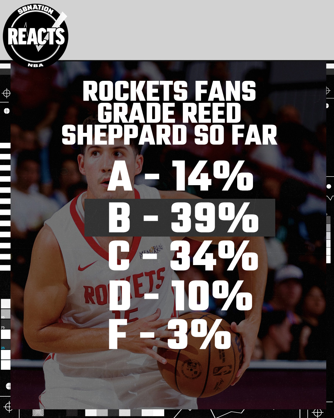 This week’s question asked you to grade the Summer League performance for Reed Sheppard. The young guard is expected to take a leap in responsibility this year, and most people were hoping to see a dominant performance from Reed in NBA Summer League to feel better about Houston’s sudden lack of guard depth after losing both Jalen Green and Dillon Brooks in the Kevin Durant deal.