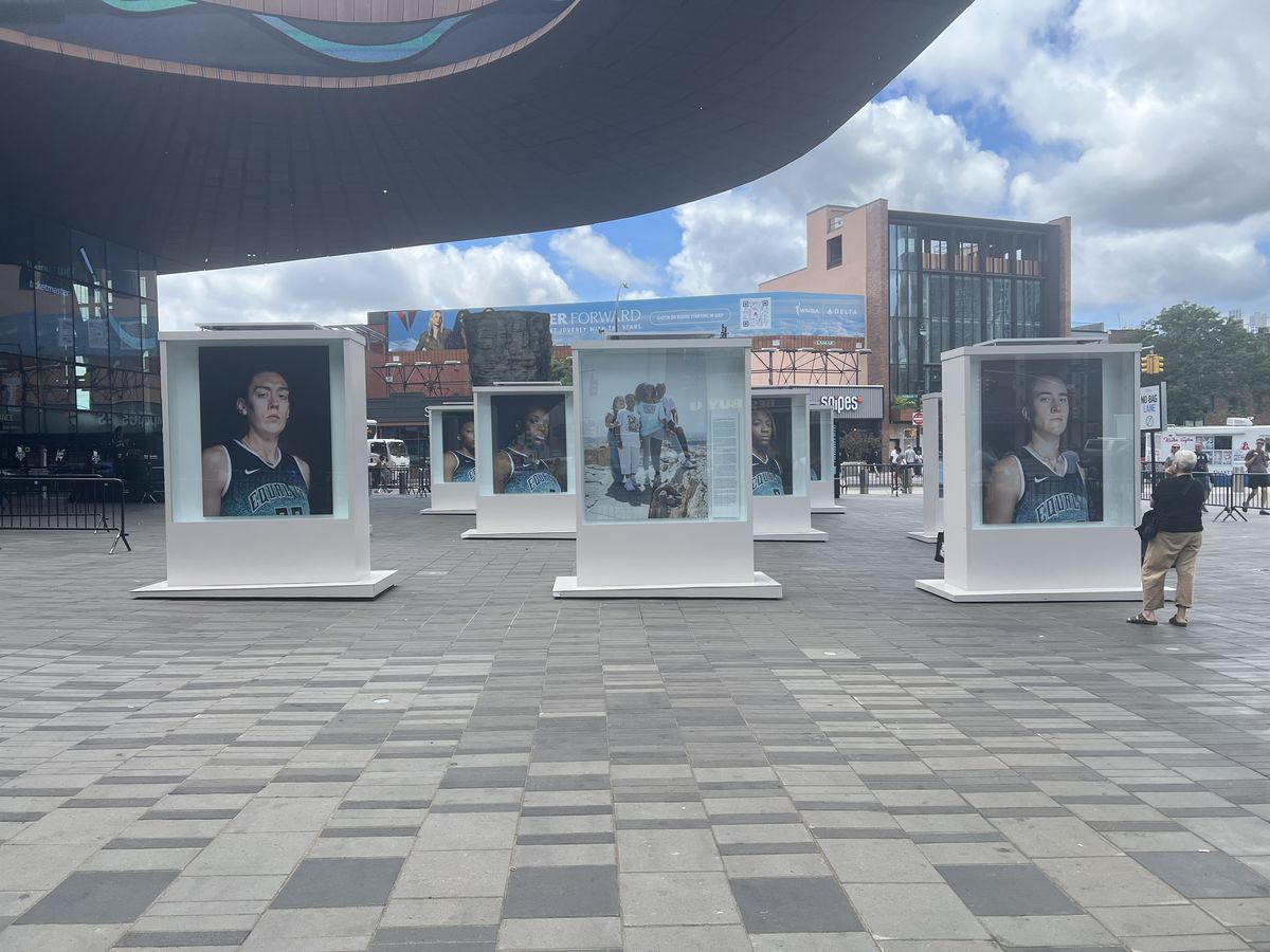 Already on the premises at Flatbush and Atlantic is local photojournalist LaToya Ruby Frazier’s “Liberty Portraits: a Monument to the 2024 Champions,” a collection of nine-foot high two-sided portraits of the team’s players stretched out on the plaza in front of the arena.