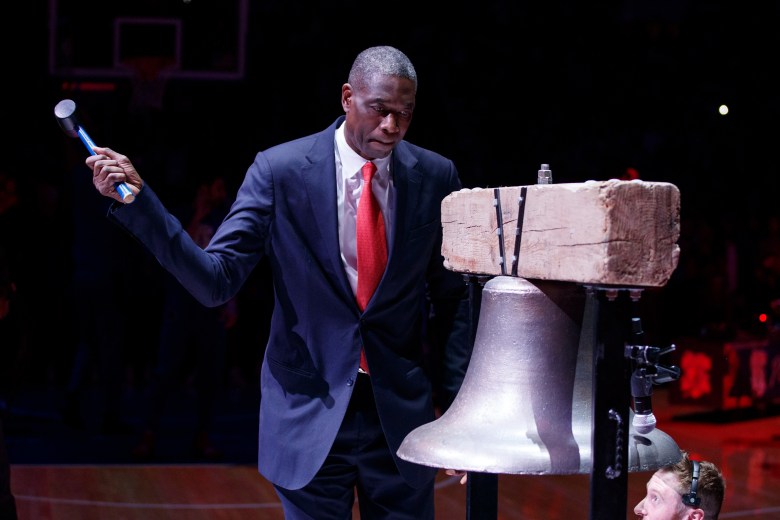 Dikembe Mutombo comes out to ring the bell prior to the first half in Game 2 of a first-round NBA basketball playoff series between the Brooklyn Nets and the Philadelphia 76ers, Monday, April 15, 2019, in Philadelphia. 76ers won 145-123. (AP Photo/Chris Szagola)