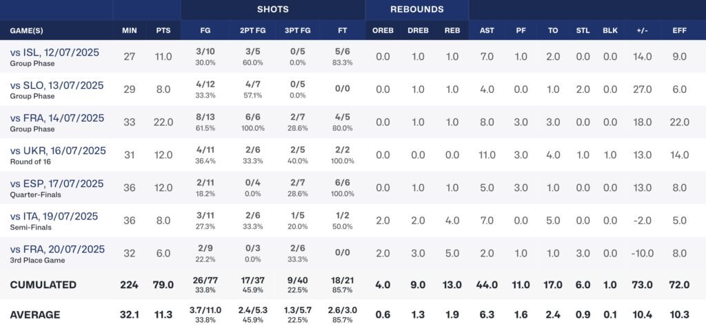Ristic finished play with averages of 11.3 points, 1.9 rebounds and 6.3 assists a game — ranked 4th in the tournament. He had 44 assists to just 17 turnovers in seven games — a 2.59 assist to turnover ratio.