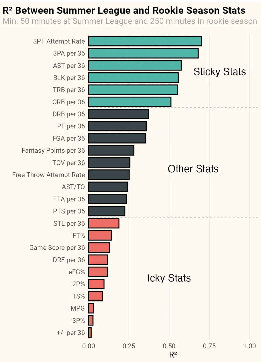As you can see, how well players — rookies specifically — shoot the ball in Vegas and how well they shoot it on the big stage just don’t have a strong correlation. One of Egor Dëmin’s 3-point makes at Summer League hit the back of the rim, bounced ten feet skyward, then fell back in. A normal bounce on that shot, and he’s just 9-of-23 from deep in Vegas, the percentage dropping over four points.
