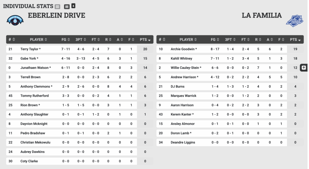 La Familia finished the night shooting 45.9 percent from the field — compared to a 38.5 percent mark for the opposition — but went just 3-15 from beyond the arc while giving up 17 offensive rebounds. Terry Taylor led all scorers with 20 points for Eberlein Drive.