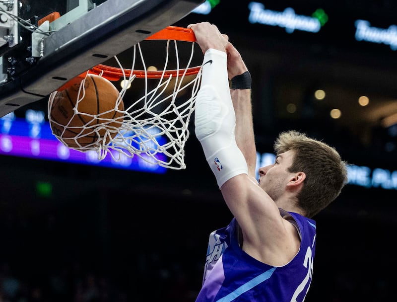 Utah Jazz forward Kyle Filipowski (22) dunks the ball during an NBA game between the Utah Jazz and the Washington Wizards at the Delta Center in Salt Lake City on Wednesday, March 19, 2025. | Brice Tucker, Deseret News