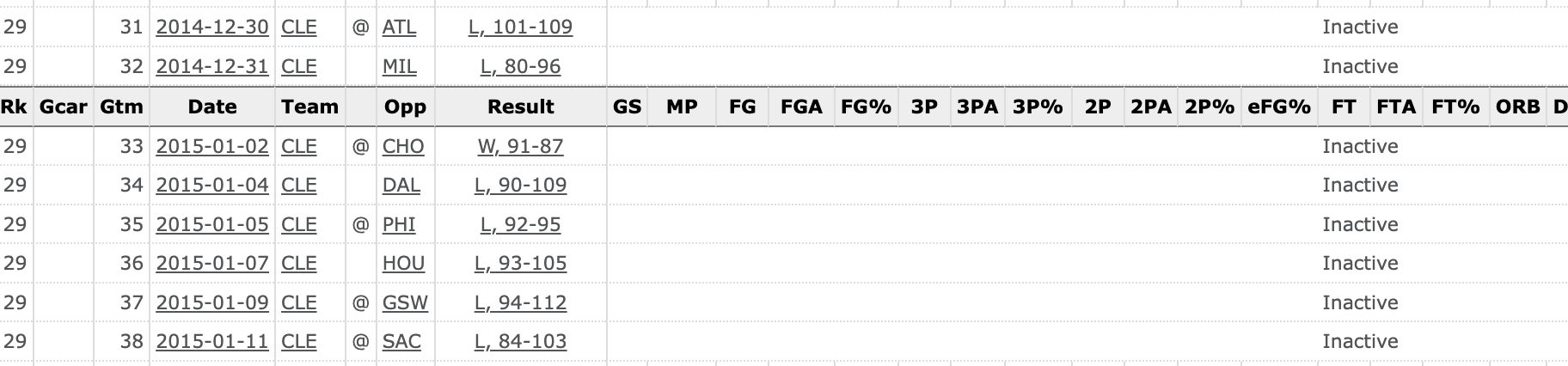 Now to be fair, maybe he’s just getting the details wrong, and he meant when LeBron came back with the Cavs for the first time. If we look at that season (2014-15), there is a decent sized gap where LeBron sat for 9 games due to a left knee and lower back injury