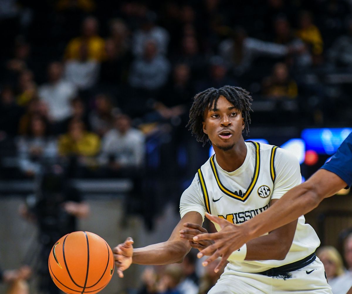 Missouri guard Anthony Robinson II (0) makes a pass in the first half of a game against Howard on Friday, Nov. 8, 2024, at Mizzou Arena. (CAL TOBIAS/ROCK M NATION)