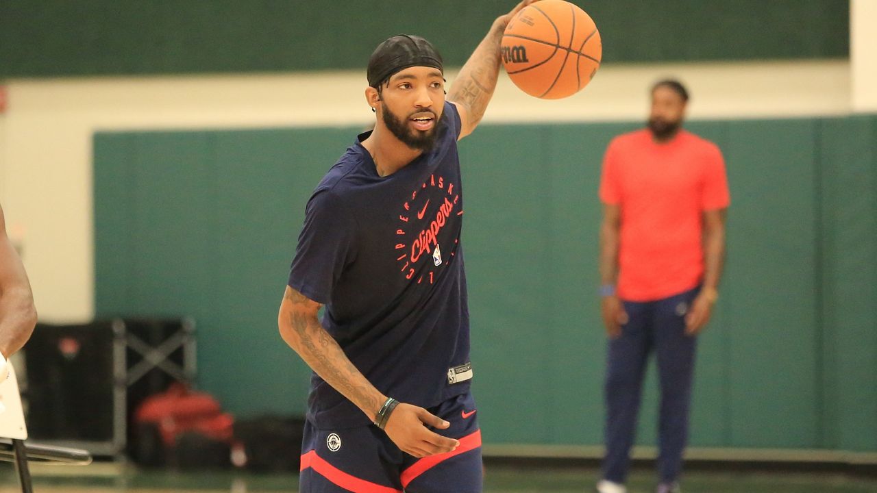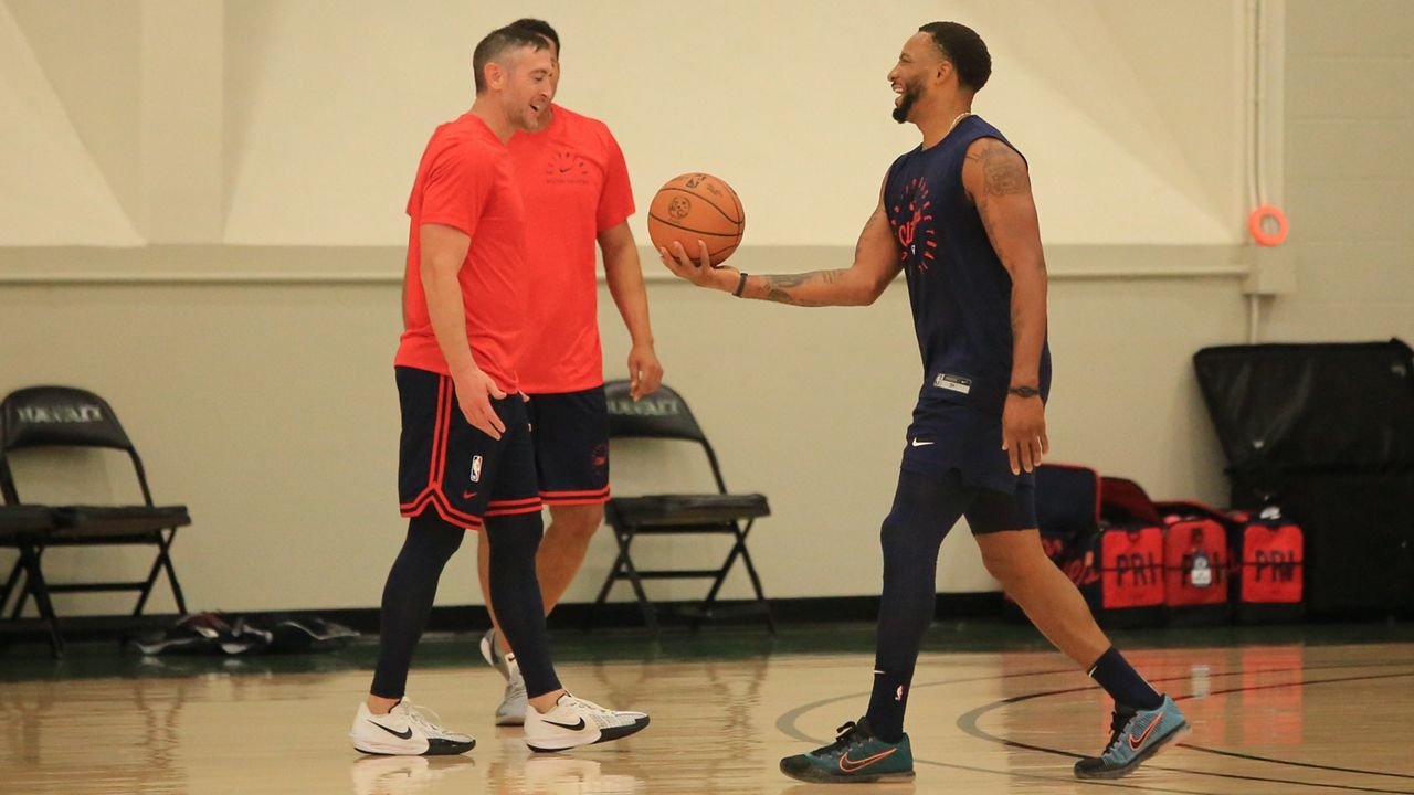 Clippers shooting guard Norman Powell, right, got in work with assistant coaches. (Spectrum News/Brian McInnis)