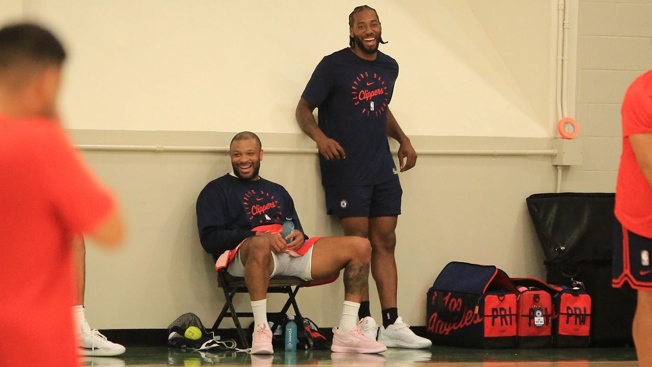 Clippers forwards Kawhi Leonard (leaning) and P.J. Tucker (sitting) shared a laugh. (Spectrum News/Brian McInnis)