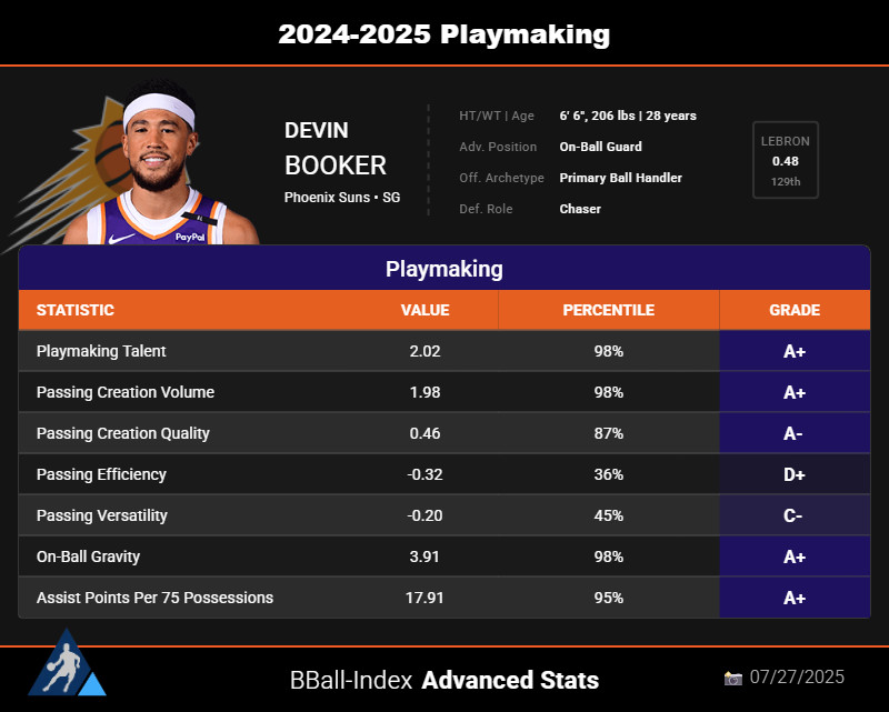 But the truth is, Booker has evolved. He sees the floor better, makes the right reads more often, and can run an offense when called upon. He may never be a traditional point guard, but as a playmaker, he’s more than serviceable. He’s steady, capable, and in the right structure, even reliable.