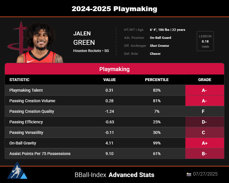 Green posted 4.4 assists per game over that stretch, but also averaged 3.0 turnovers, a ratio that raises more questions than it answers. His assist percentage with Fred VanVleet off the floor was 19.7%, third on the team behind Alperen Sengun (22.3%) and Thompson (20.4%). It’s a glimpse at his potential as a playmaker, sure, but it also reinforces the idea that he hasn’t quite figured out how to steer an offense yet.
