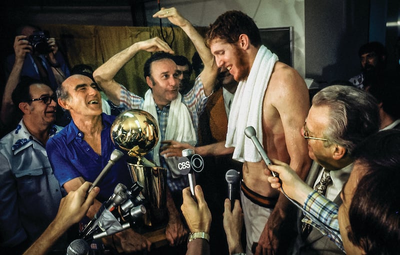 Portland Trail Blazer coach Jack Ramsay (L), assistant coach Jack McKinney (C-gesturing) and NBA Commissioner Larry O’Brien (R) present the NBA Championship trophy to team captain Bill Walton after defeating the Philadelphia 76ers. (DAVE OLSON)