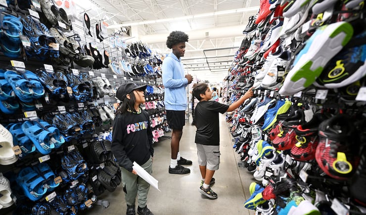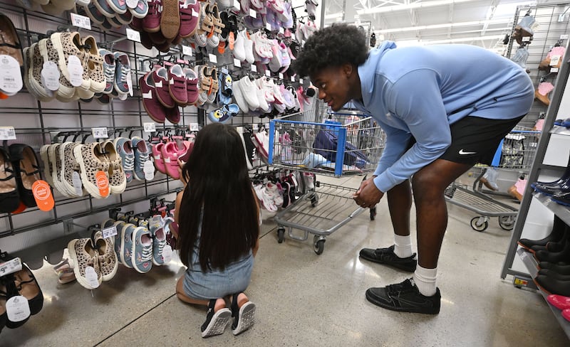 Luna P. tries to decide on a pair of shoes with the help of Utah Jazz’s Taylor Hendricks as kids from the Boys & Girls Club of Greater Salt Lake go on a shopping spree for back-to-school items at Walmart in West Jordan on Tuesday, July 29, 2025. | Scott G Winterton, Deseret News