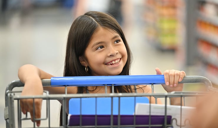 Luna P. smiles at Utah Jazz’s Taylor Hendricks as they stand in line at the registers after she and other kids from the Boys & Girls Club of Greater Salt Lake got to shop for back-to-school items at Walmart in West Jordan on Tuesday, July 29, 2025. | Scott G Winterton, Deseret News