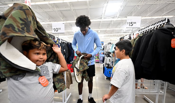 Utah Jazz’s Taylor Hendricks helps Brandon H. with a zipper and Jayden V. tries on a jacket while they and other kids from the Boys & Girls Club of Greater Salt Lake shop for back-to-school items at Walmart in West Jordan on Tuesday, July 29, 2025. | Scott G Winterton, Deseret News