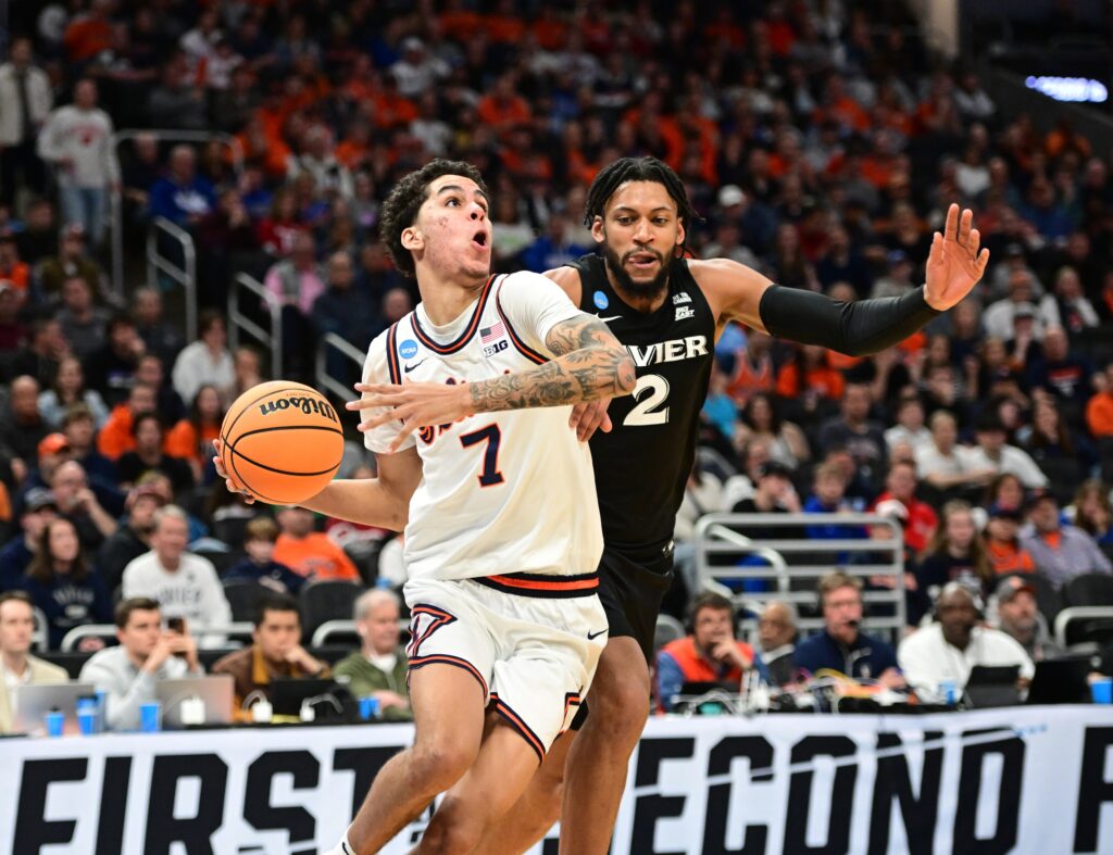 Mar 21, 2025; Milwaukee, WI, USA: Illinois Fighting Illini forward Will Riley (7) drives to the hoop past Xavier Musketeers forward Jerome Hunter (2) during the second half at Fiserv Forum. Mandatory Credit: Benny Sieu-Imagn Images
