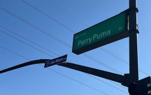 A street sign labeled “Jalen Williams Way” has been added next to the “Perry Puma Dr.” sign that marks the entrance to Perry High School. (Photo by Dylan Kane/Cronkite News)