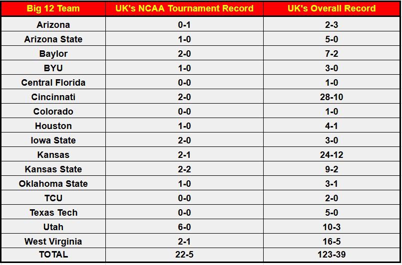 Today, we are taking a look at the Kentucky Wildcats’ record against every Big 12 team, both in regular season and NCAA Tournament play.