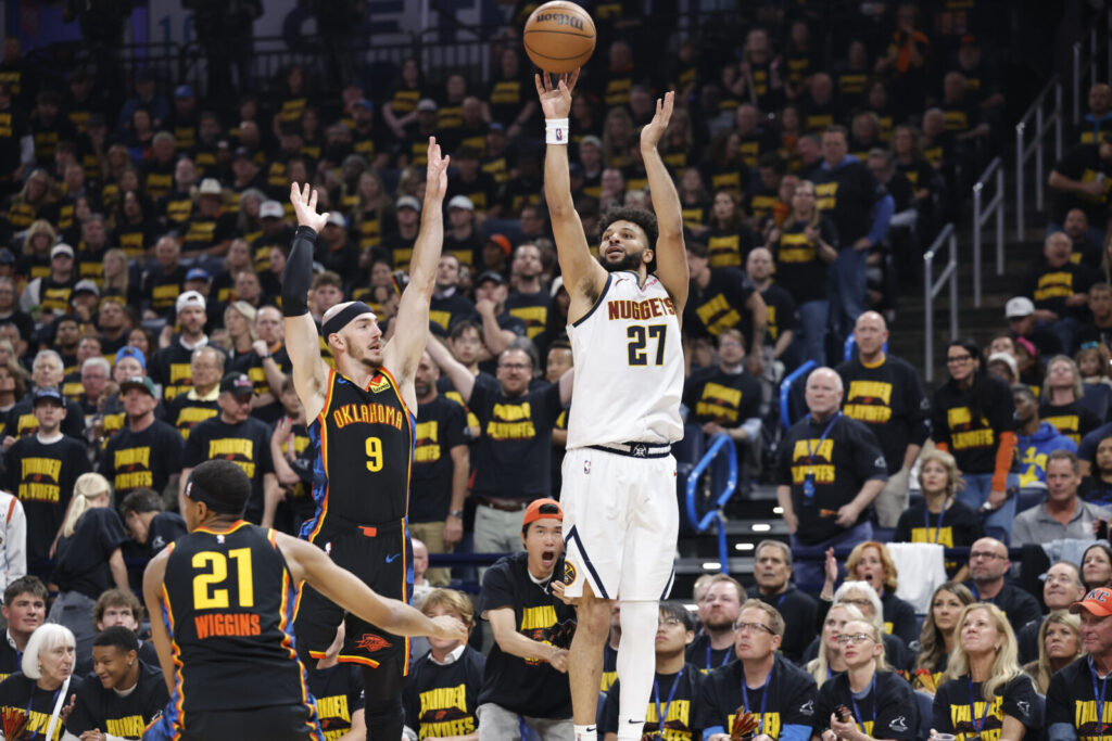 May 7, 2025; Oklahoma City, Oklahoma, USA; Denver Nuggets guard Jamal Murray (27) shoots a three point basket against the Oklahoma City Thunder in the second quarter during game two of the second round for the 2025 NBA Playoffs at Paycom Center. Mandatory Credit: Alonzo Adams-Imagn Images