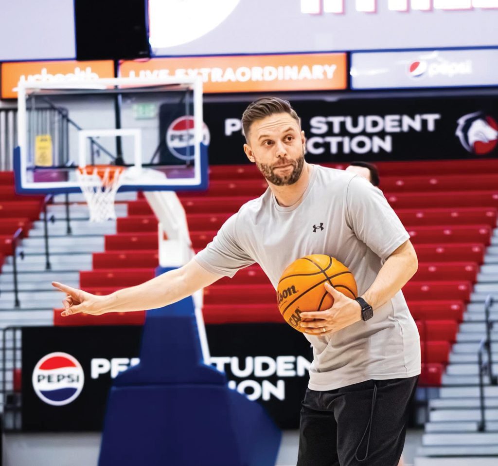 Zach Ruebesam demonstrates a drill to his team at CSU-Pueblo. Ruebesam’s been a college basketball coach since 2016. (Courtesy photo)