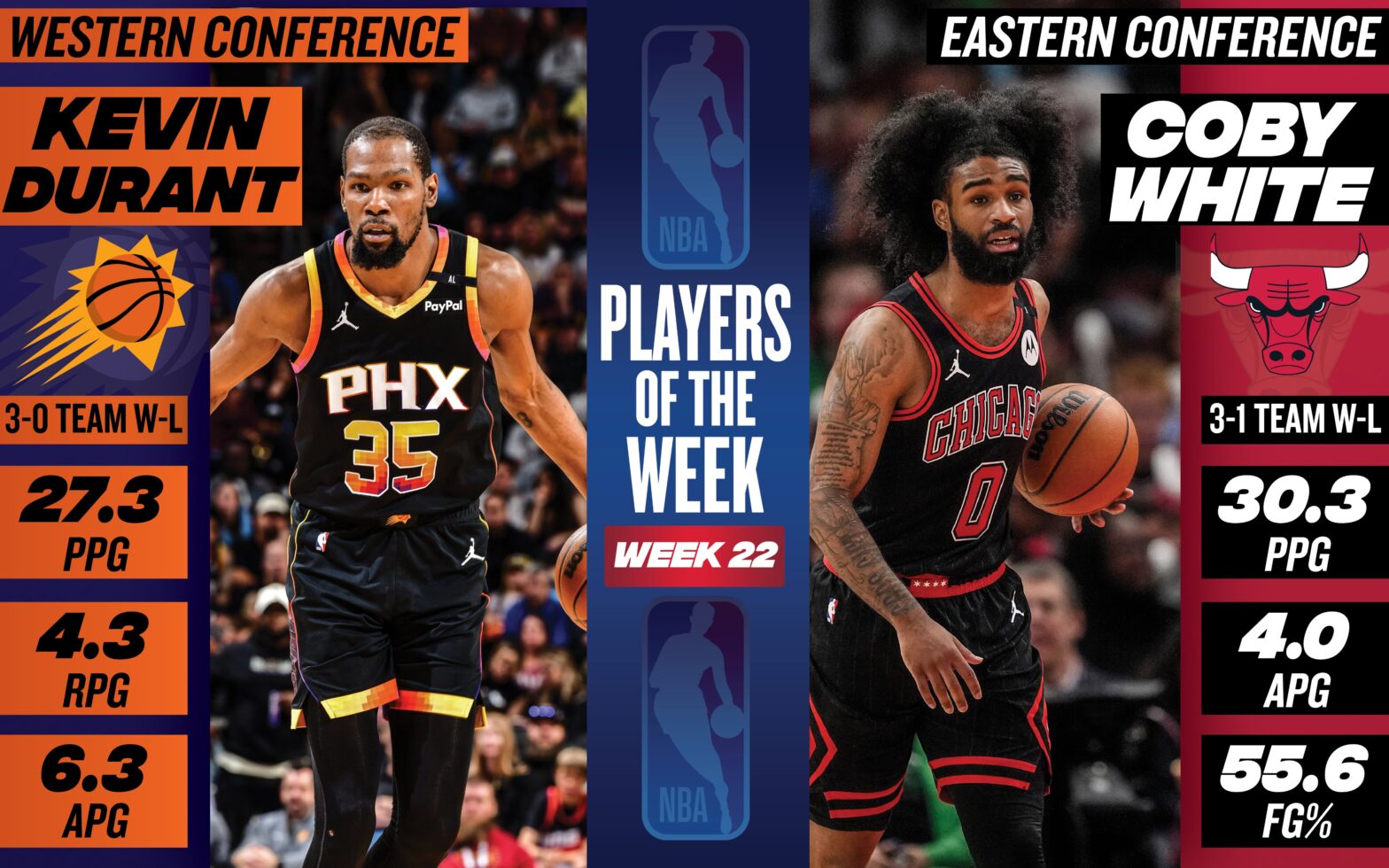 Phoenix Suns forward Kevin Durant and Chicago Bulls guard Coby White have been named the NBA Players of the Week for Week 22 of the 2024-25 season (March 17-23).