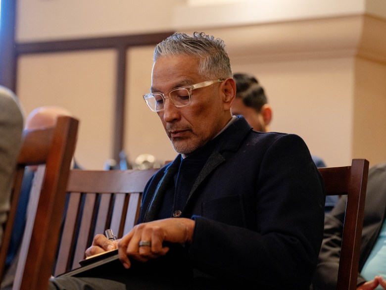 Bobby Perez, Spurs Sports and Entertainment’s chief legal officer and general counsel, takes notes during a Commissioners Court meeting at the Bexar County Courthouse on Jan. 7. Credit: Brenda Bazán / San Antonio Report