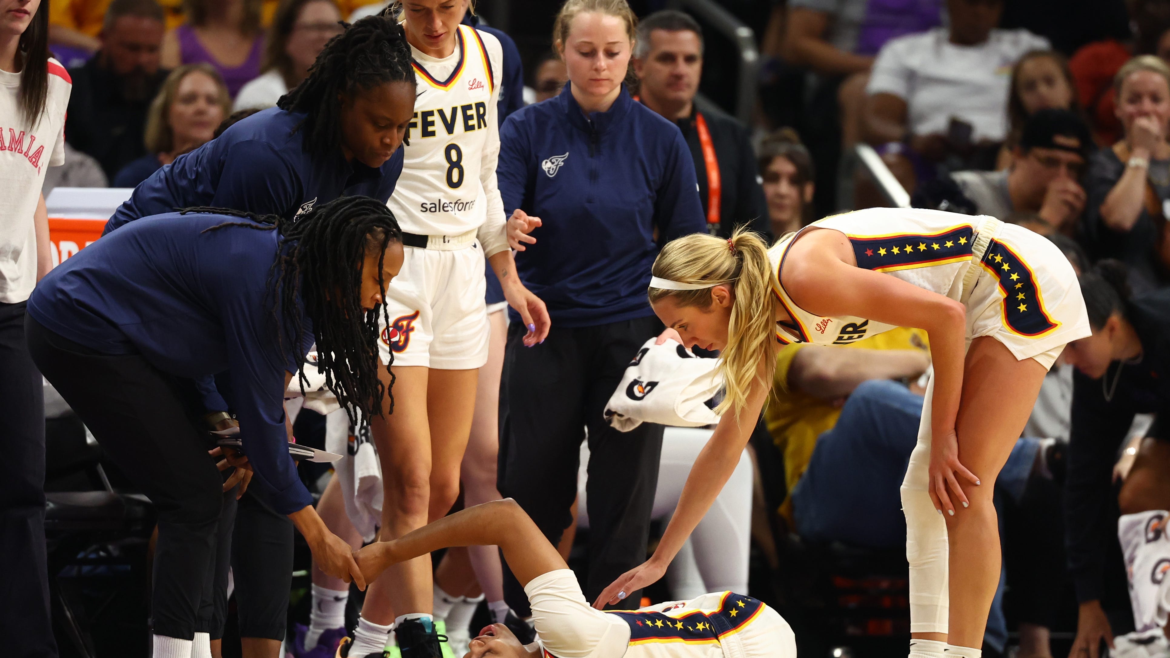 Coach Stephanie White called a timeout, and the Fever huddled around Colson, using towels to shield her from the crowd as trainers assessed her. She eventually was helped off the floor by trainer Todd Champlin and teammate Bri Turner, putting no weight on her left leg. She was then ruled out for the game with a left knee injury.