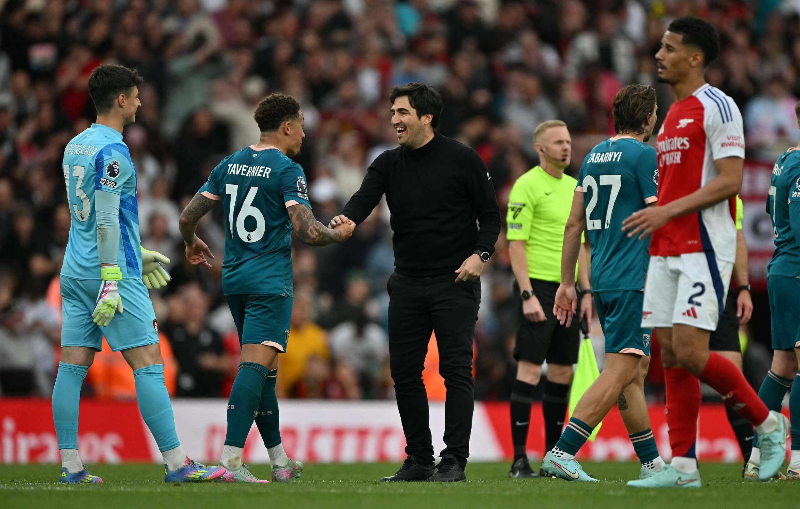Iraola celebrates Bournemouth’s 2-1 win over Arsenal at the Emirates Stadium (Glyn Kirk/AFP via Getty Images)