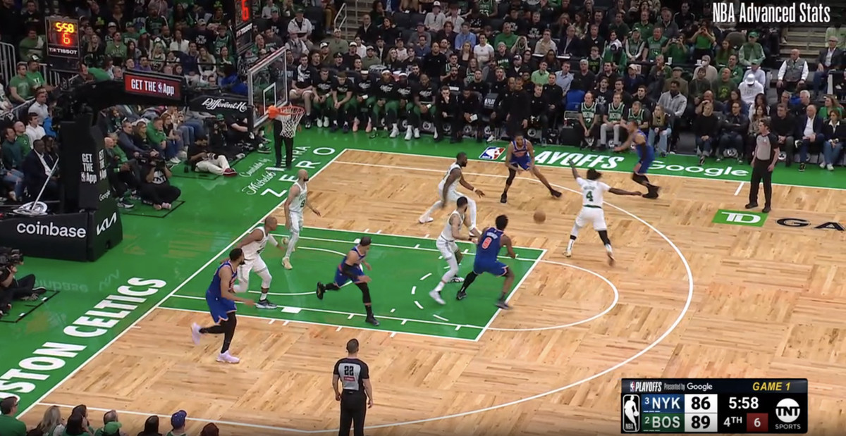 But Brown does not switch. Instead, it’s yet another open three in the corner for the Knicks — who desperately needed easy points to get back into Game 1 after being down by 20.