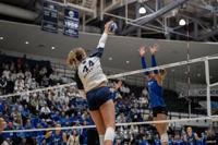 Middle blocker Maggie Mendelson (44) spikes the ball in the Elite 8 round if the NCAA women’s volleyball tournament between Penn State and Creighton on Sunday, Dec. 15, 2024 in Rec Hall in University Park, Pa. The Nittany Lions beat the Bluejays 3-2.