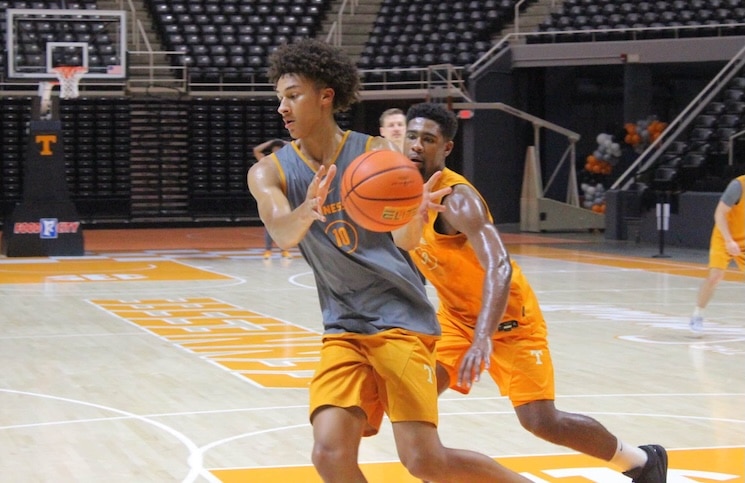 Tennessee’s Jaylen Carey plays defense on true freshman Nate Ament. Photo from Ryan Sylvia / Rocky Top Insider.