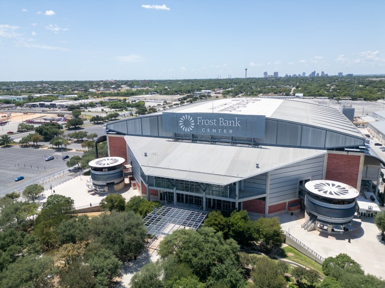 Drone shot of the Frost Bank Center in August 2025. Credit: Cooper Mock for the San Antonio Report