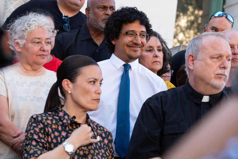 District 6 Councilmember Ric Galvan and San Antonio Mayor Gina Ortiz Jones stand with community members during a press conference about Project Marvel outside of City Hall on Monday. Credit: Amber Esparza / San Antonio Report