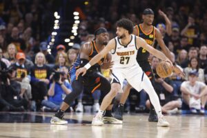 May 5, 2025; Oklahoma City, Oklahoma, USA; Oklahoma City Thunder guard Luguentz Dort (5) defends Denver Nuggets guard Jamal Murray (27) during the second half in game one of the second round for the 2025 NBA Playoffs at Paycom Center. Mandatory Credit: Alonzo Adams-Imagn Images
