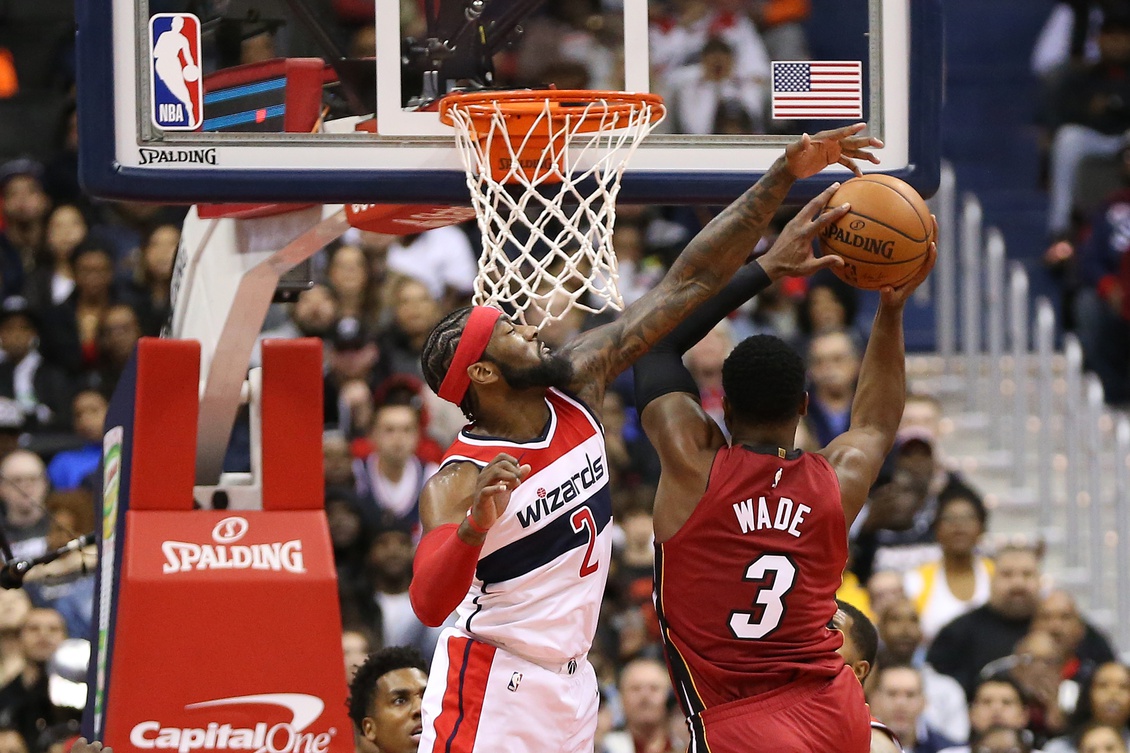 Oct 18, 2018; Washington, DC, USA; Washington Wizards guard John Wall (2) blocks the shot of Miami Heat guard Dwyane Wade (3) in the fourth quarter at Capital One Arena. Mandatory Credit: Geoff Burke-USA TODAY Sports