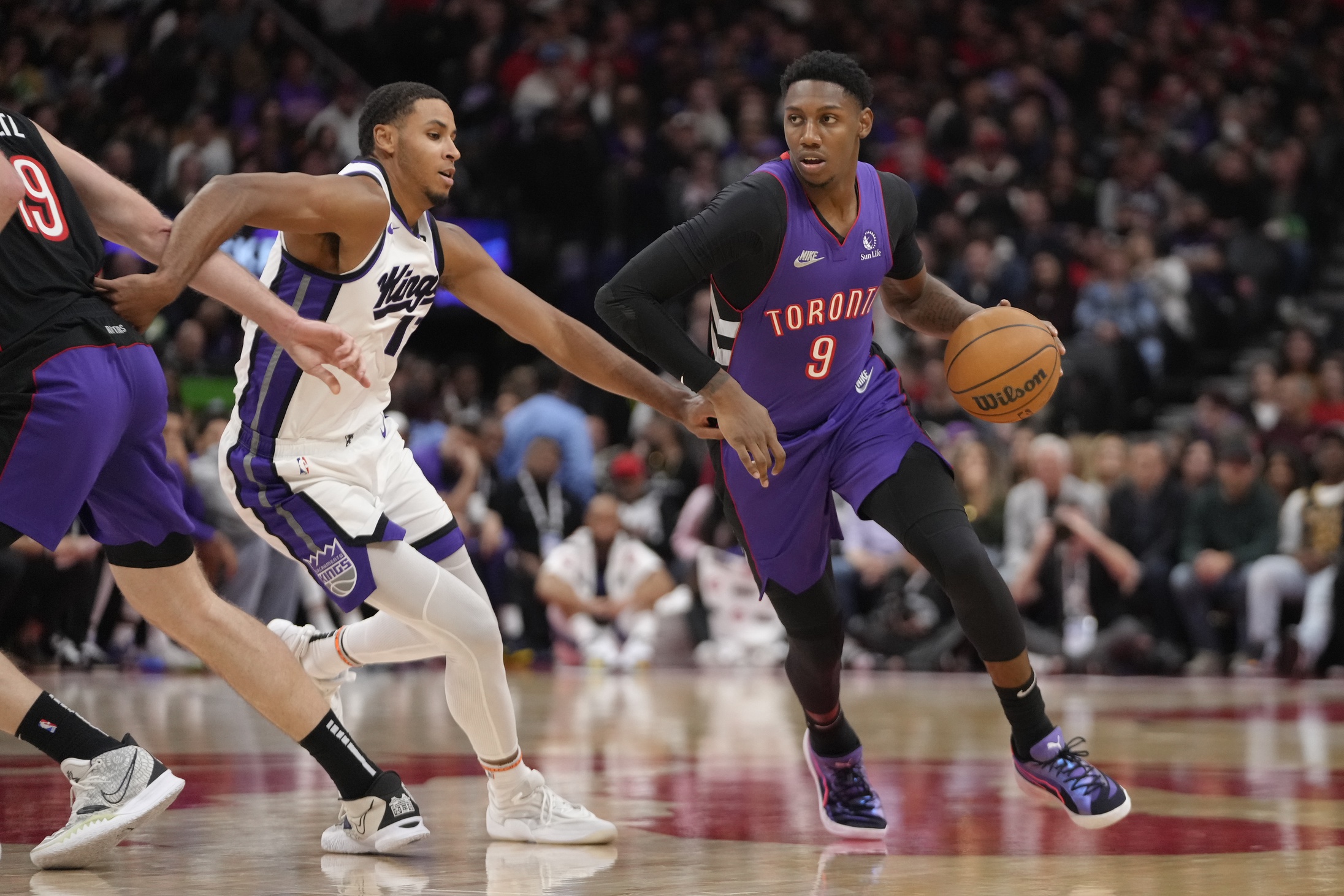 Nov 2, 2024; Toronto, Ontario, CAN; Toronto Raptors guard RJ Barrett (9) drives to the net against Sacramento Kings forward Keegan Murray (13) during the first half at Scotiabank Arena. Mandatory Credit: John E. Sokolowski-Imagn Images