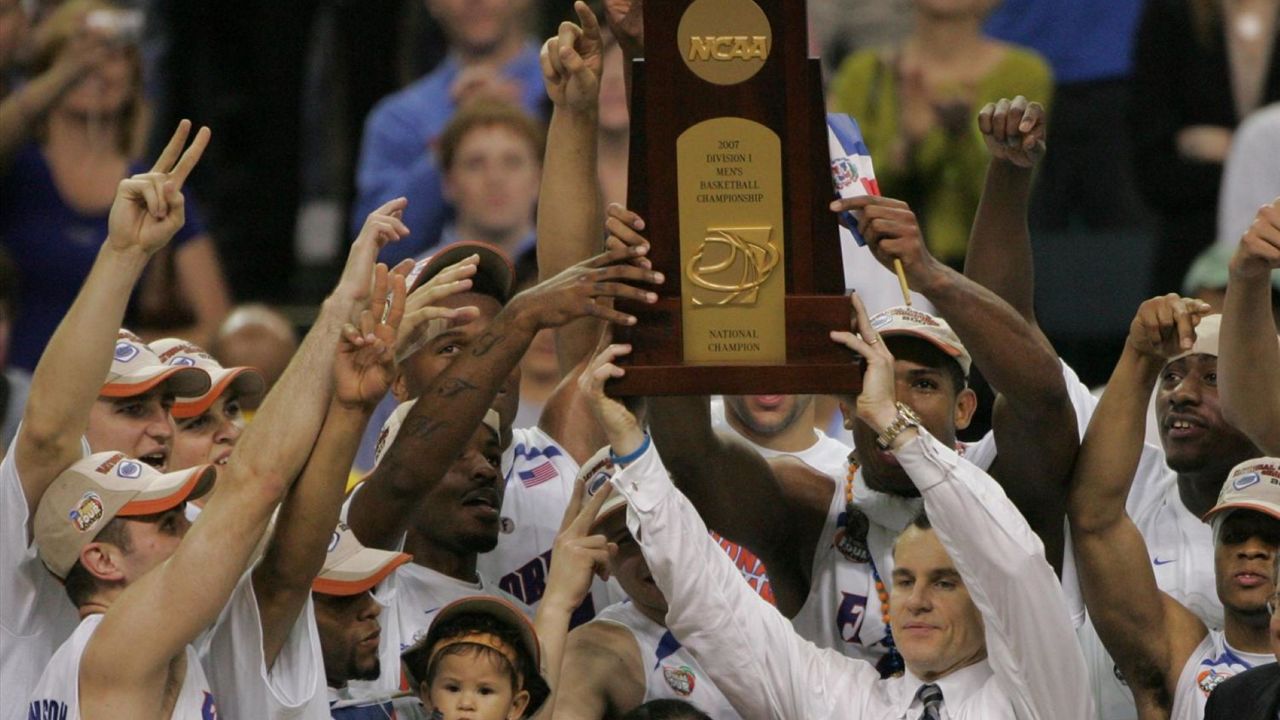 Billy Donovan holds up the championship trophy after coaching the Gators to the title in 2007, the team’s 2nd in 2 seasons. (Associated Press)