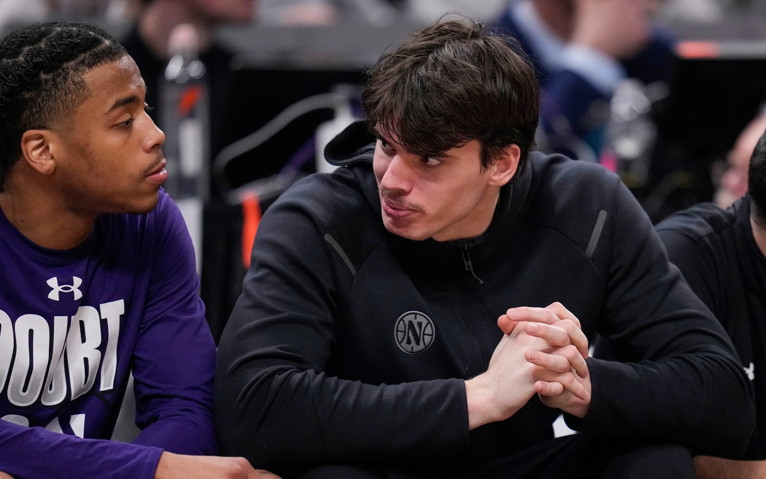 Northwestern Wildcats guard Brooks Barnhizer (13) sits on the bench and talks to Northwestern Wildcats guard K.J. Windham (24) on Thursday, March 13, 2025, during the second round of the men’s Big Ten tournament at Gainbridge Fieldhouse in Indianapolis. The Wisconsin Badgers defeated the Northwestern Wildcats, 70-63.