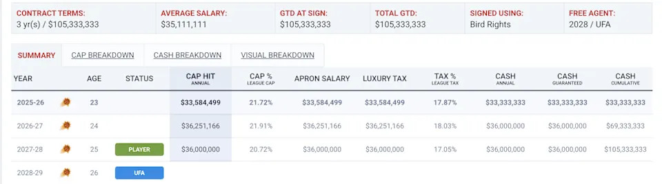 Jalen Green signed a 3-year, $105 million contract with the Houston Rockets, with an average annual salary of $35,111,111. In 2025-26, Green will earn a base salary of $33,333,333, while carrying a cap hit of $33,584,499 and a dead cap value of $33,333,333.