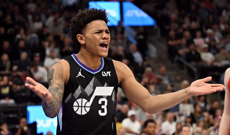 Utah Jazz guard Keyonte George (3) complains to a referee as the Jazz play the Portland Trail Blazers at the Delta Center in Salt Lake City on Wednesday, April 9, 2025. Jazz won 133-126 in OT. | Scott G Winterton, Deseret News
