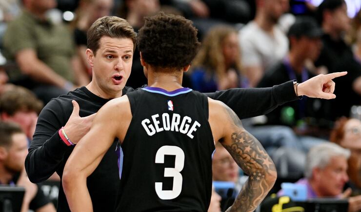 Utah Jazz head coach Will Hardy talks with Jazz guard Keyonte George (3) as the Jazz and the Portland Trail Blazers play at the Delta Center in Salt Lake City on Wednesday, April 9, 2025. | Scott G Winterton, Deseret News