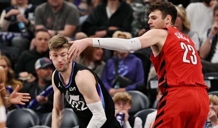 Utah Jazz forward Kyle Filipowski (22) defends Portland Trail Blazers center Donovan Clingan (23) as they play at the Delta Center in Salt Lake City on Wednesday, April 9, 2025. Jazz won 133-126 in OT. | Scott G Winterton, Deseret News