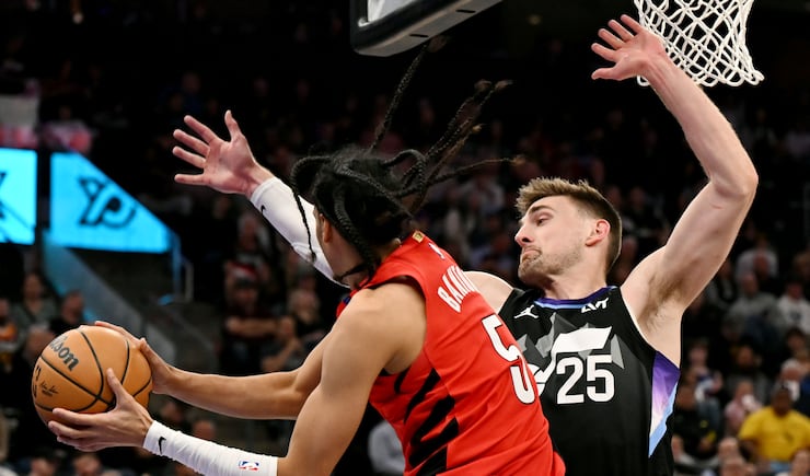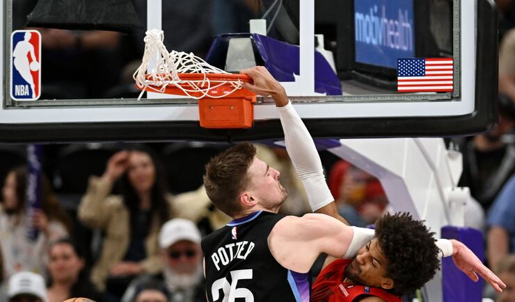 Portland Trail Blazers guard Dalano Banton (5) is defended by Utah Jazz center Micah Potter (25) as the Jazz and the Trail Blazers play at the Delta Center in Salt Lake City on Wednesday, April 9, 2025. | Scott G Winterton, Deseret News