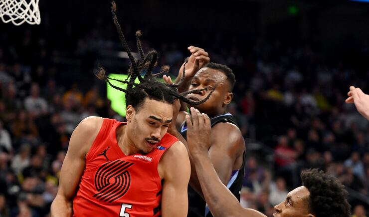 Portland Trail Blazers guard Dalano Banton (5) is defended by Utah Jazz center Oscar Tshiebwe (34) and Jazz guard Collin Sexton (2) as they play at the Delta Center in Salt Lake City on Wednesday, April 9, 2025. Jazz won 133-126 in OT. | Scott G Winterton, Deseret News