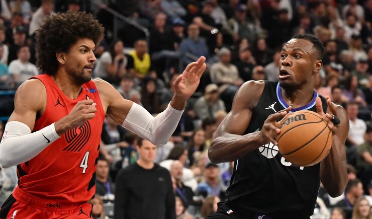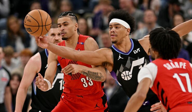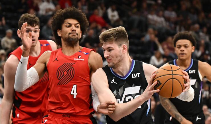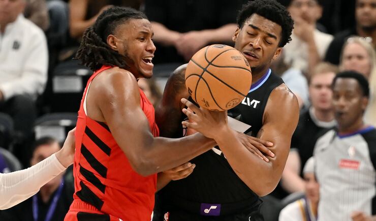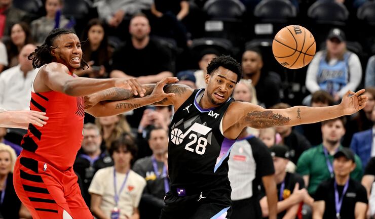 Utah Jazz forward Brice Sensabaugh (28) has the ball knocked away by Portland Trail Blazers forward Toumani Camara (33) as they play at the Delta Center in Salt Lake City on Wednesday, April 9, 2025. | Scott G Winterton, Deseret News