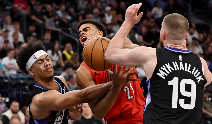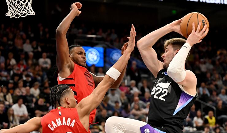 Utah Jazz forward Kyle Filipowski (22) battles Portland Trail Blazers forwards Toumani Camara (33) and Jabari Walker (34) as they play at the Delta Center in Salt Lake City on Wednesday, April 9, 2025. Jazz won 133-126 in OT. | Scott G Winterton, Deseret News