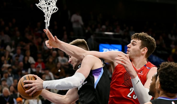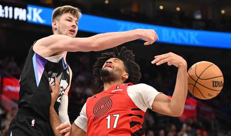 Utah Jazz forward Kyle Filipowski (22) gets hit in the face by Portland Trail Blazers center Donovan Clingan (23) as they play at the Delta Center in Salt Lake City on Wednesday, April 9, 2025. Jazz won 133-126 in OT. | Scott G Winterton, Deseret News