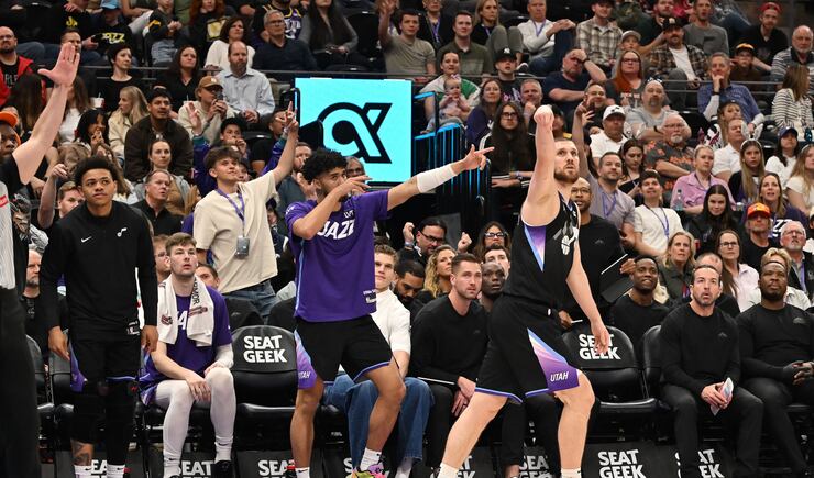 Utah Jazz players and fans react as Jazz guard Svi Mykhailiuk (19) sinks a 3-point shot as they and the Portland Trail Blazers play at the Delta Center in Salt Lake City on Wednesday, April 9, 2025. Jazz won 133-126 in OT. | Scott G Winterton, Deseret News