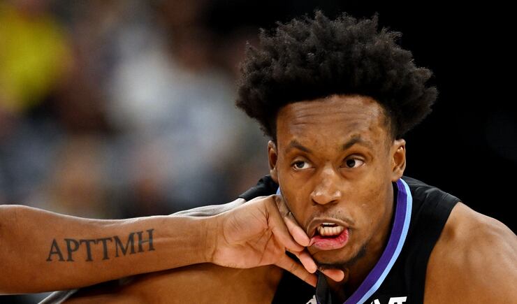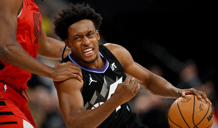 Utah Jazz guard Collin Sexton (2) battles Portland Trail Blazers forward Jabari Walker (34) as he drives toward the hoop as they play at the Delta Center in Salt Lake City on Wednesday, April 9, 2025. Jazz won 133-126 in OT. | Scott G Winterton, Deseret News